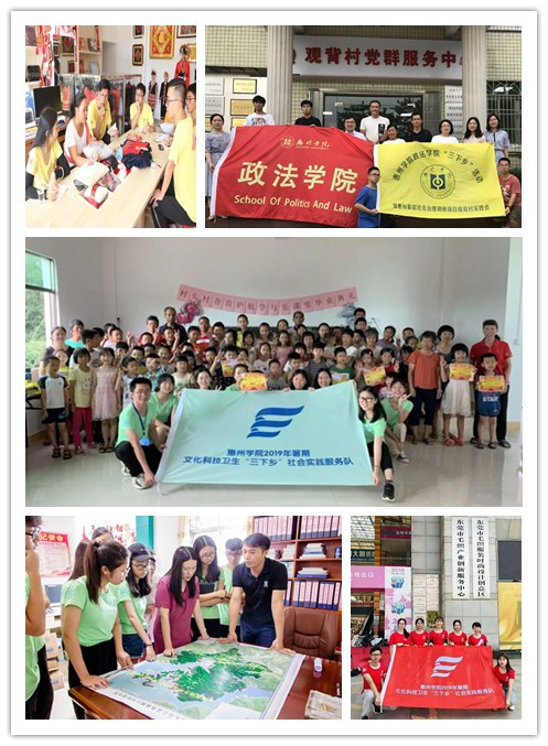 2019年是中华人民共和国成立70周年,是五四运动100周年,为深入学习贯彻习近平新时代中国特色社会主义思想和党的十九大精神,2019年7月-8月,根据学校团委的统一部署和安排,政法学院以“砥砺七十年•献礼新时代”为主题,组织“青春梦之队”、“政青春团队”、“前进队”、“撸起袖子加油队”和“惠星社会服务小分队”等多支青年大学生暑期“三下乡”社会实践队,奔赴惠州市惠东县白盆珠镇横江村、清远市连南瑶族自治县、东莞市大朗镇、惠州市博罗县观背村、惠州市汝湖镇村头村等地开展了2019年暑期“三下乡”社会实践活动,活动成效明显。