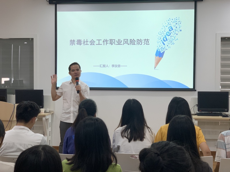 李汝吉社工以禁毒社会工作为基点,生动而具体地阐述了禁毒社会工作的风险来源及风险事故、禁毒社会工作中的风险分析、禁毒社会工作常见职业风险及防范、禁毒社会工作风险控制措施,并结合工作中的实际案例和禁毒社会工作的发展现状,帮助同学们更好的理解禁毒社会工作。课堂气氛活跃而融洽,同学们受益匪浅。