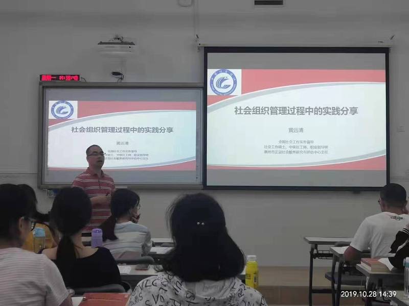 为促进同学们更深入了解社会组织,提高对社会组织管理模式的理解,2019年10月28日上午,政法学院社工系在社会工作仿真实验室开展了《社会组织管理概论》嵌入式课程,惠州市正益社会服务研究与评估中心的中心主任黄远清督导主讲,2017级社会工作1班全体学生参加。