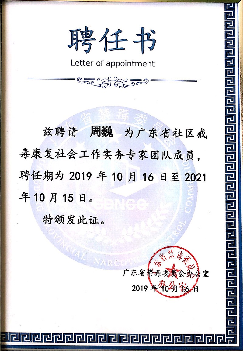 我校周巍博士受邀出席了本次研讨会,并被广东省禁毒委员会办公室聘请为省社区戒毒康复社会工作实务专家团队成员。