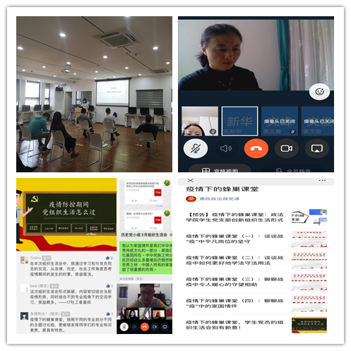 学生支部在原来的“蜂巢课堂”基础上,创新党员组织生活会的形势和内容,开展“疫情下的蜂巢课堂”,通过利用“钉钉”视频会议互相交流和讨论学习,并结合“学习强国”中丰富的平台资源,互相积极分享相关文章和视频。组织生活会结合了我院四个专业学科创新讨论主题。将学生党员按照专业分成四个党小组,每个组讨论的主题都具有鲜明的专业特色:法学专业围绕“战疫中的法律学习”,讨论在战疫中应如何“学法守法用法”;社工专业立足于社工“助人自助”的理念,交流“战疫中令人暖心的守望相助”;行管专业从“战疫中平凡岗位的坚守”的角度出发,感受平凡中的伟大;历史专业从“家国情怀”这一角度,讲述了在疫情期间最切身的感触。讨论结束后,每个小组还将讨论内容做成推文,在微信公众号平台发布,让我院全体学生党员和入党积极分子都参与到讨论交流中,涌现了许多真实感动的心得体会。如17社工班曾同学留言“这次组织生活会形式新颖,内容密切结合当前疫情防控形势,同时结合不同专业进行交流学习,受益颇多”。