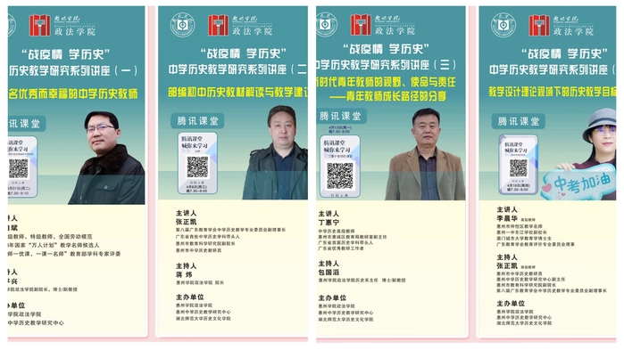 今年突发的疫情,给全国各级各类学校的教学工作带来了巨大的冲击,我校也进入网上授课模式。在此背景下,为了给不能返校、在家学习的学生提供形式多样学术资源和课程形式,政法学院和去年成立的惠州中学历史教学研究中心在院领导的支持下,决定举办“战疫情·学历史”中学历史教学研究线上系列讲座,邀请广东和湖北两地知名中学历史教育专家给历史学专业学生和惠州市中学历史教师进行在线授课和交流。3月份以来,先后邀请了湖北省正高级特级教师李自斌、惠州市历史教研员张正凯、惠城区历史教研员丁惠宁、惠州一中东江学校高级教师李晨华等全国和惠州本地知名历史教师举行了四场线上学术讲座。第一场讲座举办之后,就吸引了湖北师范大学历史文化学院的注意,从第二场开始,系列讲座由我校政法学院和湖北师范大学历史文化学院联合举办。系列讲座除有惠州学院和湖北师范大学两校历史学专业学生及惠州市部分中学历史教师听课外,还吸引了广东第二师范学院、岭南师范学院、肇庆学院、韶关学院、江汉大学、广西民族大学、聊城大学、延安大学、北华大学、赣南师范大学、萍乡学院、渭南师范学院、牡丹江师范学院、内江师范学院和黑河学院等全国十余所高校历史学专业教师和在校及毕业学生的关注和参与,上线听课和交流人数共计超过2500人次,在全国中学历史界引起了较大反响,收到了良好的社会效果。很多学校老师表示,惠州学院为全国历史专业学生和中学历史教师提供了一个很好的机会。
