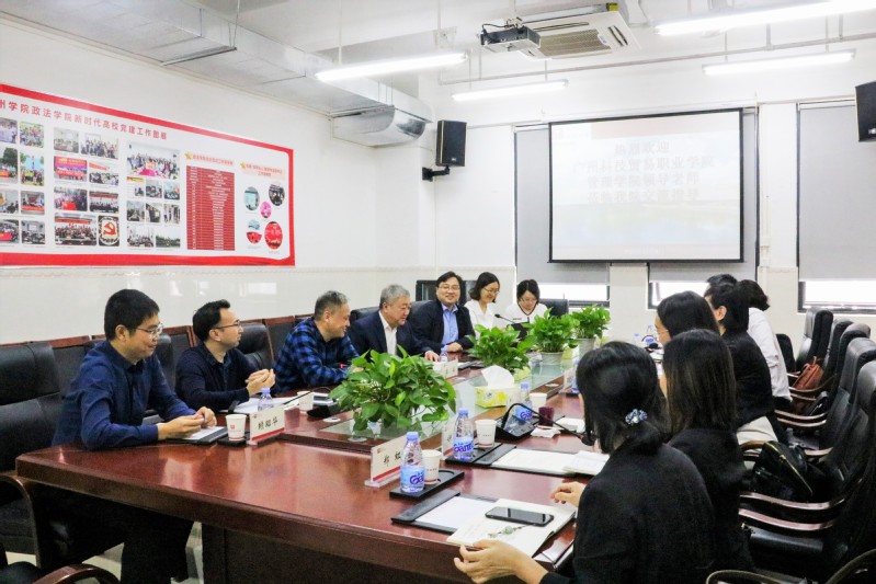 11月4日上午,广州科技贸易职业学院管理学院院长王爱晶一行莅临惠州学院,并在政法学院1608会议室举行座谈交流。学校团委书记赖昭华,教务处副处长李庆春,政法学院院长蒋炜,党总支书记李实,副院长周巍,社会工作专业负责人柳春慈和行管社工教工党支部书记王秋花等出席座谈会。