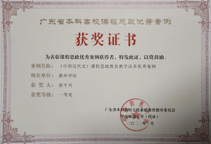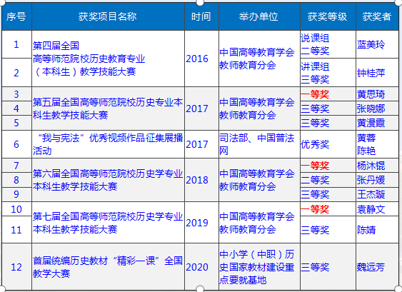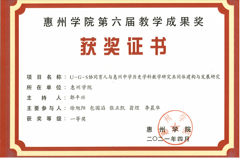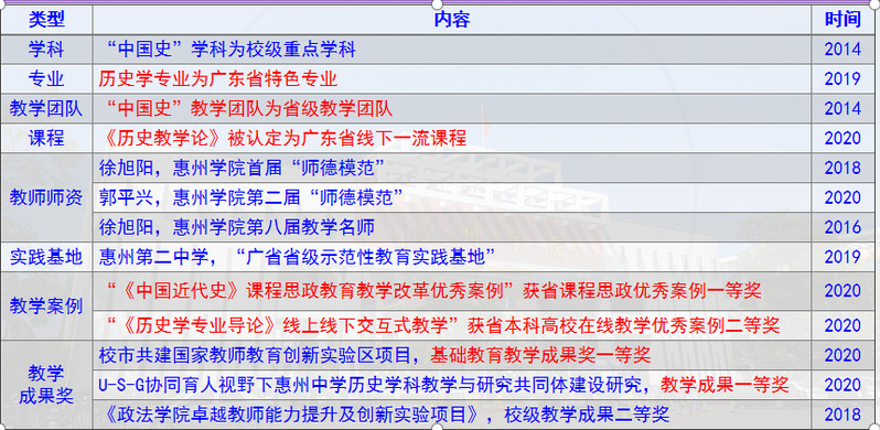 广东省级特色专业、“中国史”省级教学团队、“中国史”校级重点学科、惠州学院历史学专业U-G-S协同育人平台。