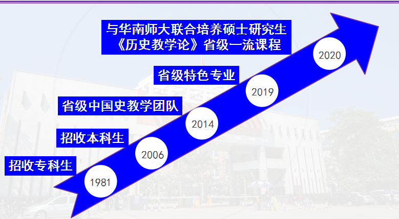 历史学专业前身为惠阳师范专科学校政史专业,1981年招收专科生,2006年开始招收历史学专业本科生,2013年获批校级专业综合改革试点建设项目,2015年入选惠州学院“卓越中学教师培养计划”,2019年获批广东省级特色专业,2020年《历史教学论》被认定为广东省一流本科课程。