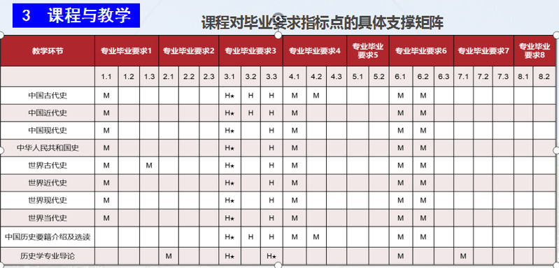 本专业课程设置,注重专业课程与公共课程、教师教育课程的融合,注重课程内容与中学教育相关标准的有效对接,注重各类课程满足“一践行三学会”的需求。在满足“践行师德”需求方面,主要有马克思主义基本原理概论、毛泽东思想与中国特色社会主义理论体系概论、思想道德修养与法律基础等课程;在满足“学会教学”需求方面,主要有中外通史课程、历史教学论、教师专业发展、中学历史学科核心素养解读等课程;在满足“学会育人”需求方面,主要有学校教育基础、心理健康与道德教育、班主任工作艺术等课程;在满足“学会发展”需求方面,主要有创业基础、教育见习、专业考察等课程。