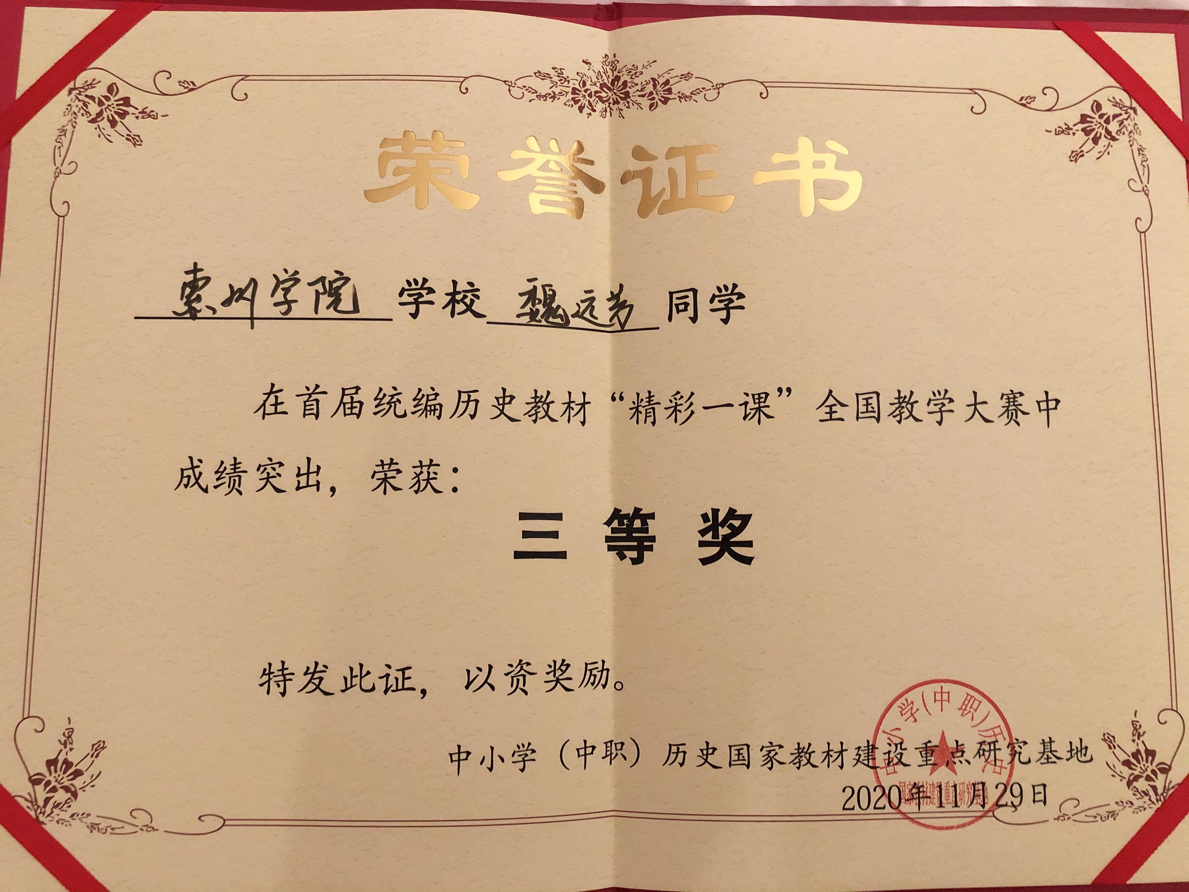 《三国两晋南北朝的政权更迭与民族交融》教学设计是该同学2020年11月参加首届统编历史教材“精彩一课”全国教学大赛参赛课题,并在比赛中荣获三等奖(指导教师:张熊、徐旭阳、包国滔)。据悉,该项比赛系由教育部教材局审批、由中小学(中职)历史国家教材建设重点研究基举办,也是目前唯一的全国规模的历史学专业师范生教学能力大赛,本次大赛有北京师范大学、华东师范大学、华中师范大学等六所部属师范大学和各省属重点师范大学共计40余所院校90名选手参加,名校云集,高手如林,比赛设一二三等奖,总获奖率为60%。我校作为仅有的几所地方普通院校受邀参赛。为组织好本次比赛,政法学院高度重视,由主管副院长负责,组成参赛团队,进行训练和指导比赛。《中学历史教材研究》是由中小学(中职)历史国家教材建设重点研究基举办、华中师范大学出版社公开出版,向全国公开发行,第五辑专门收录本次比赛优秀教学设计,向全国各大师范院校历史学专业师生推广。