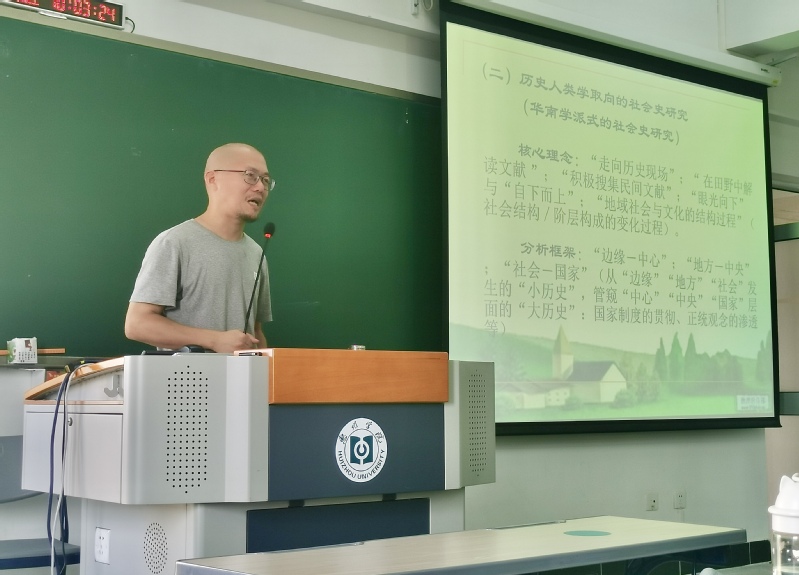 包国滔先从“历史人类学取向的社会史研究”出发,通过介绍该研究的源流历史和发展现状,激发同学们关注研究热点和学界动态的学科意识。在此基础上,他向同学们着重述介和讲解了历史人类学式田野史学的理论与方法,强调应坚持“走向历史现场”、“文献与田野相结合”、“眼光向下”和“自下而上”的史学理念,坚持遵循从“边缘”“地方”“社会”的“小历史”管窥“中心”“中央”“国家”层面的“大历史”的分析路径。随后,他还通过两个典型的田野案例即南海西樵镇延陵村的市场建立与控制、惠东平山街道角峰畲村的山居生活坚守与改变,为同学们“接地气”地解释了历史人类学式田野史学对打破传统看法、还原历史真相的现实意义与田野经验。