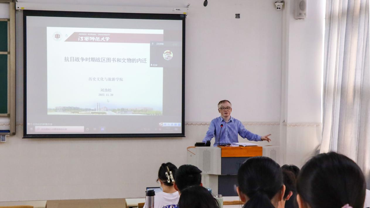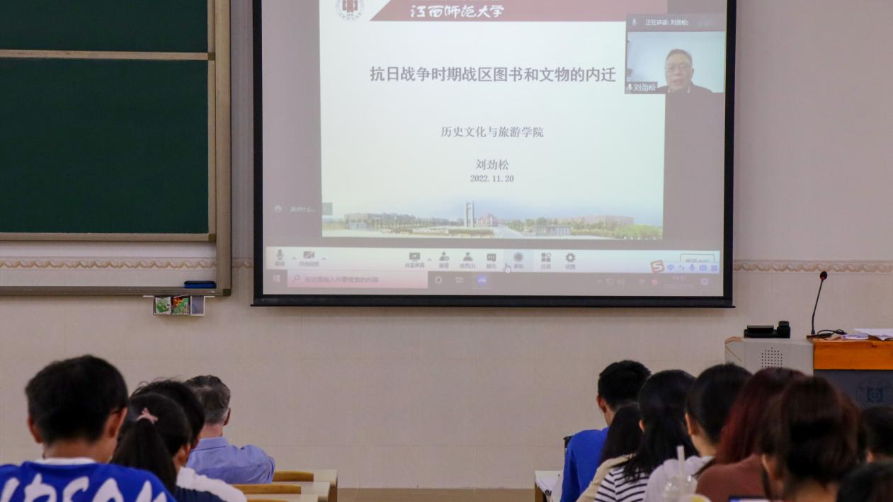 11月19日下午,政法学院历史学专业在旭日科技大楼B座207教室举办历史学专业系列讲座(二)——“抗日战争时期战区图书和文物的内迁” 学术讲座,由江西师范大学历史系教授刘劲松主讲,政法学院徐旭阳教授主持讲座,由于疫情原因,讲座采用线上方式进行,21级历史学专业全体同学参加学习。