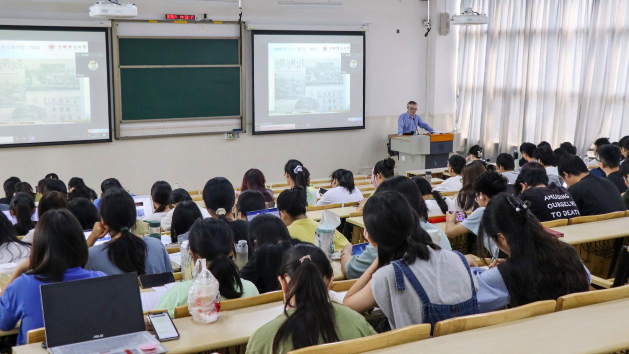 正式开讲前,徐旭阳教授向同学们介绍了刘劲松教授的基本情况,高度赞扬了刘教授在中国近代文化史、政治史、抗战史研究方面的丰硕成果,特别是在战时图书和文物内迁研究方面处于学界最前列地位。