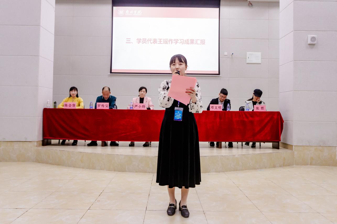 在结业典礼上,尹春侠老师和王瑶老师对本次培训进行学习成果汇报。她们表示在这次培训中既有专业理论授课,又有丰富的现场教学,给他们带来了强烈的视觉冲击和头脑风暴。通过本次培训他们得到了观念上的洗礼,理论上的提高,知识上的积淀,教学技艺的增长,收获满满。接着,邓文明作为授课教师代表用办事效率高、专业水平高、学习热情高来总结本次培训,他希望本次培训后老师们仍然能继续交流学习、实现资源共享,助力历史教学高质量发展。