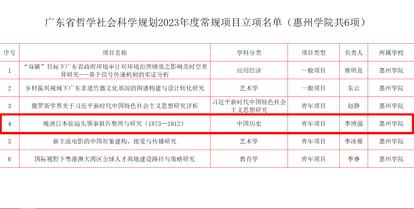 经个人申报、专家评审,我院教师李博强博士申报的课题《晚清日本驻汕头领事报告整理与研究(1873—1912)》获批立项。据悉,惠州学院今年共有6项获准立项。