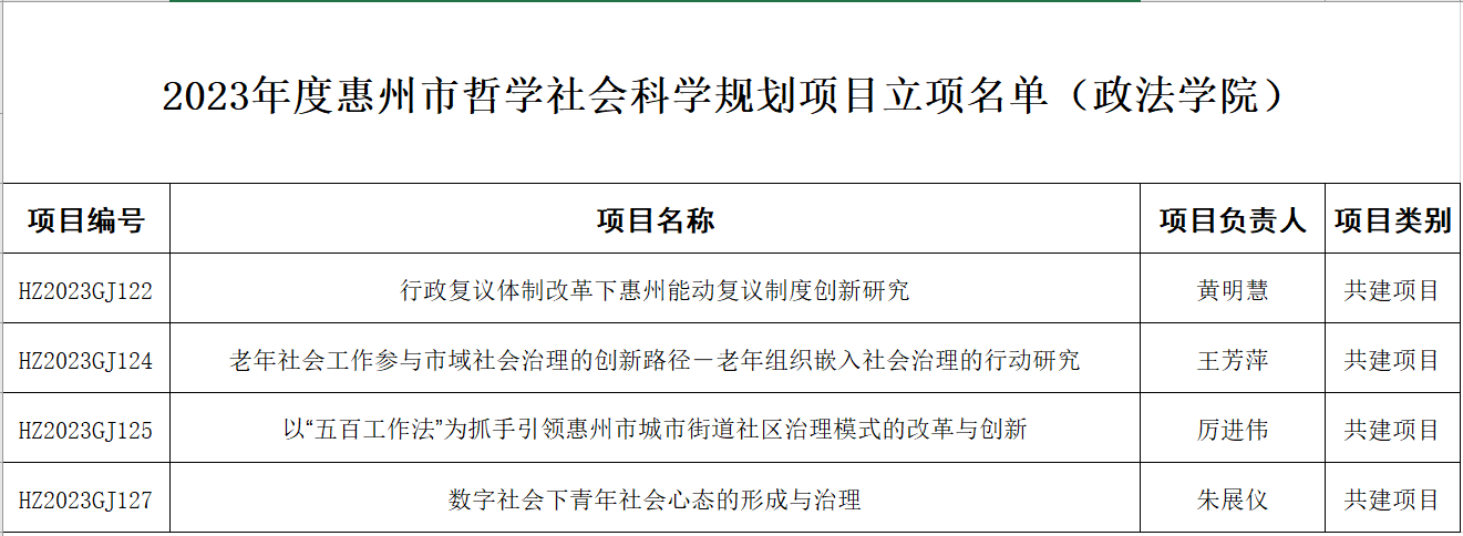 2023年7月10日,惠州市社科联发布《关于公布2023年度惠州市哲学社会科学规划项目立项名单的通知》,经过严格的专家评审组评议、市社科联党组审议、市社科规划办复核等程序,最终评出2023年度惠州市哲学社会科学规划立项项目251项。