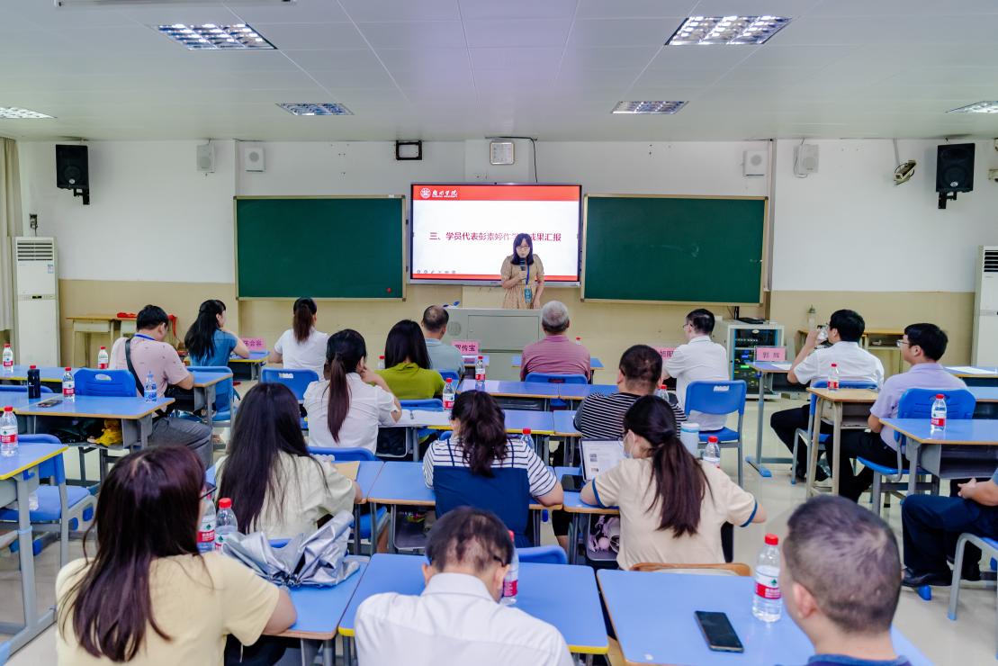 接下来,在惠州一中跟岗的学员代表张瑞花老师和在东江高级中学跟岗的彭素婷老师分别作了学习成果汇报。张老师深入分享了她在培训中的各种收获和感悟,表示这次培训对自己将来的工作和生活都有了很多新的帮助和思考。彭老师以郭辉老师严谨治学不断成长为例幽默风趣地分享了如何成为一名优秀的教师,引发了学员们的强烈共鸣。