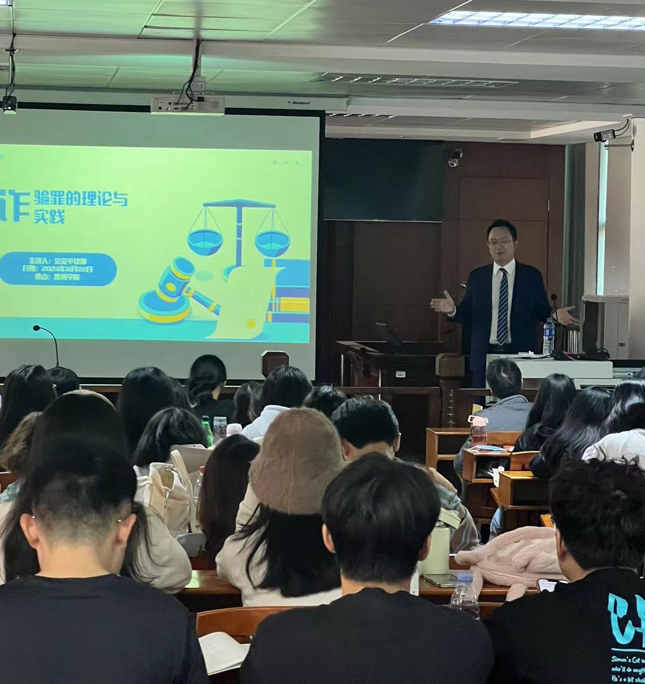 余安平律师首先介绍了诈骗罪的历史沿革,然后深入分析了诈骗罪保护的法益以及诈骗罪在司法实践中的运用。另外,余律师还与同学们分享了自己独创的技术辩护的方法,技术辩护要遵循有力原则、有理原则、有利原则,要“大胆假设和小心求证”。余律师运用深厚的历史学养、扎实的法律理论功底和丰富的刑事辩护经验,让学生们更加深入理解了诈骗罪的特征及构成要件,并深刻的体会到写作功底、条文解析能力和证据质证能力在法律实践中的重要性。