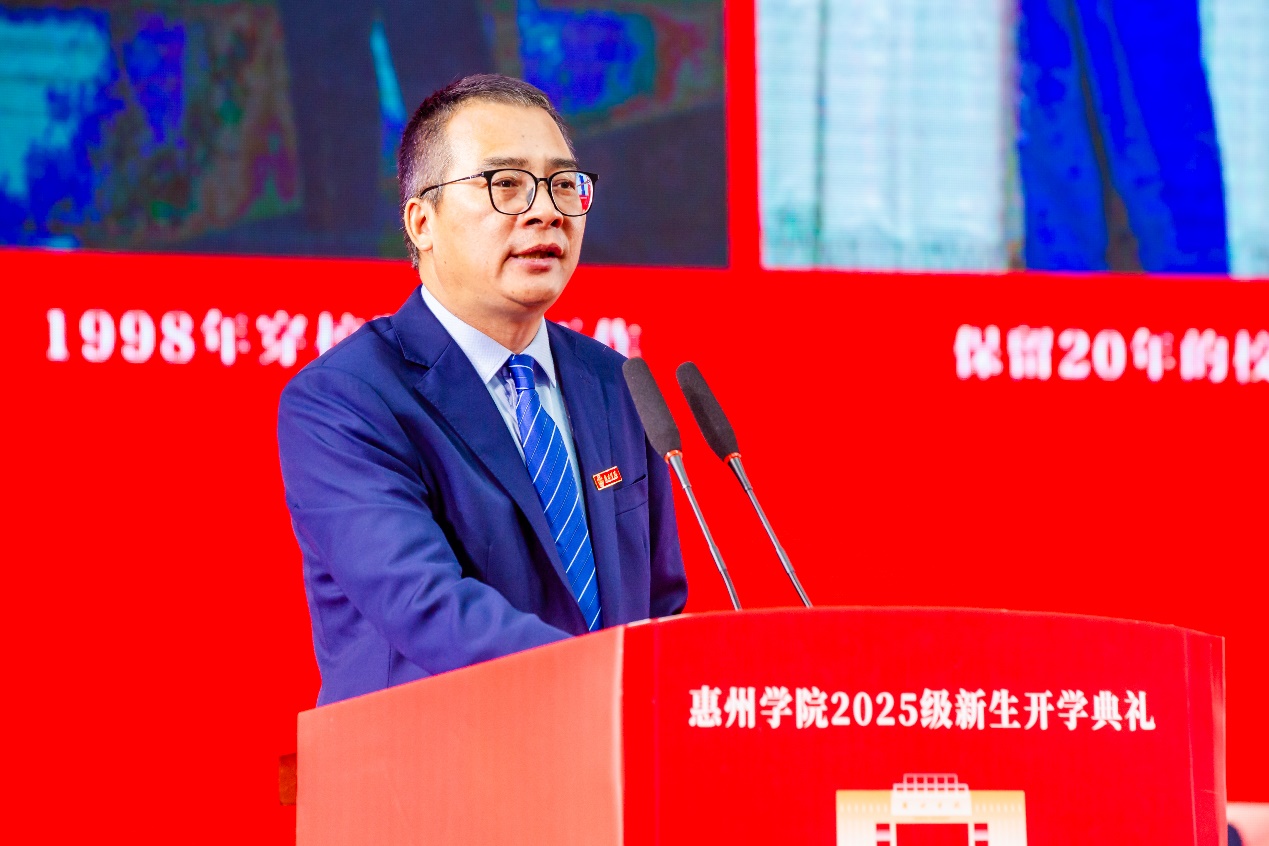 赵毅逞老师现为广州市南武中学政治科组长,高中思想政治正高级教师、广东省特级教师,2020年入选广州市基础教育高层次引进人才,2023年起担任广州市名师工作室主持人,曾获全国优秀教育园丁、广东省五·一劳动奖章等荣誉。9月18日,赵老师应邀在我校2025级新生开学典礼上发言。他结合自身经历,向新生分享了大学阶段的“通关秘籍”,建议师弟师妹们尽快实现“三个转变”、做到“三种学习”,从“被动成长”转向“主动进化”,以专业为基础、以情怀为支撑,踏实走好大学每一步。寄语同学们珍惜在惠州学院的时光,努力汲取知识、锻炼思维、塑造人格。