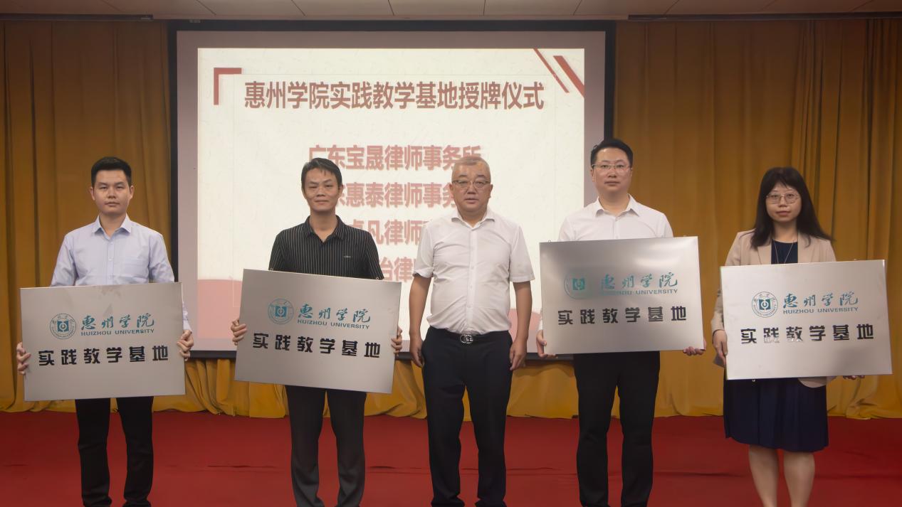 接着,举行了惠州学院实践教学基地授牌仪式。蒋炜院长对广东宝晟律师事务所、广东惠泰律师事务所、广东卓凡律师事务所、广东臻和治律师事务所等四家新设立的实践教学基地进行了授牌。实践教学基地为法学学子提供了历练成长的沃土,为法学专业发展注入了新的活力,是校政行企资源互补、协同育人、共赢发展的重要平台。