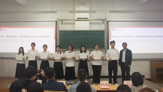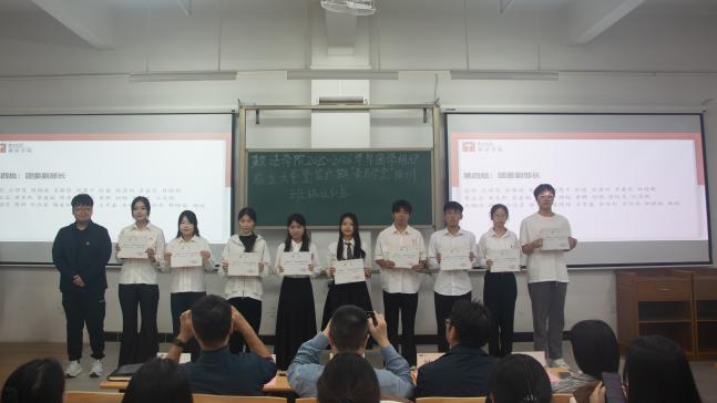 2025-2026学年团学组织成立大会开始。刘华宣读了本届学生干部名单,并与在场领导、老师一同为优秀学员颁奖。他希望新一届学生干部牢记服务同学的初心,以实际行动践行使命,共同推动学院建设与发展。
