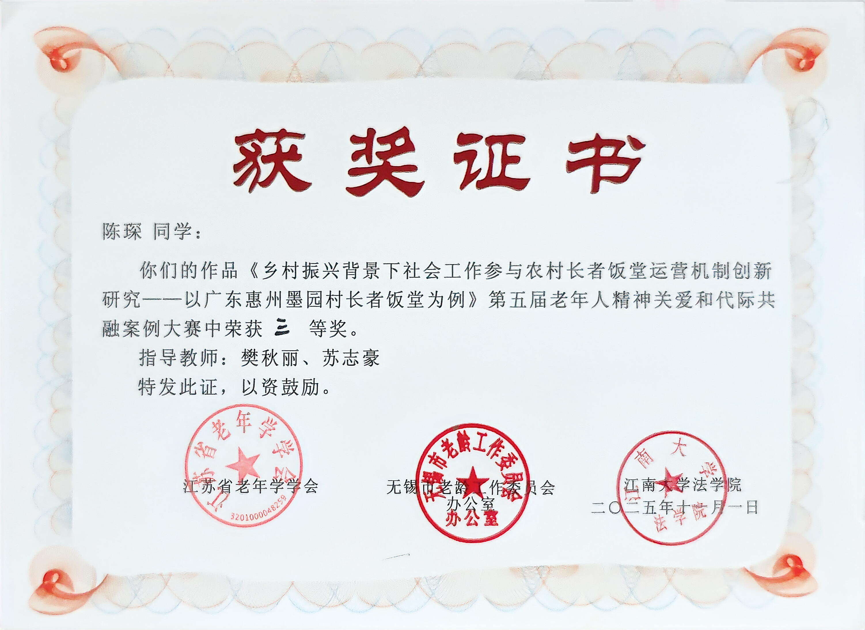 我院22级社会工作专业学生陈琛在樊秋丽、苏志豪老师的指导下,凭借主题为《乡村振兴背景下社会工作参与农村长者饭堂运营机制创新研究——以广东惠州墨园村长者饭堂为例》的案例作品顺利闯入决赛。该案例作品重点围绕“统筹‘一老一小’服务,发展中国式代际共融”命题,并深度结合农村老年助餐实际需求,为农村社区适老化改造和实现“老有所养”提供了实务路径。陈琛在案例筛选、现场展演等环节中,展现出扎实的专业知识与出色的实务分析能力,最终在大赛中荣获三等奖。