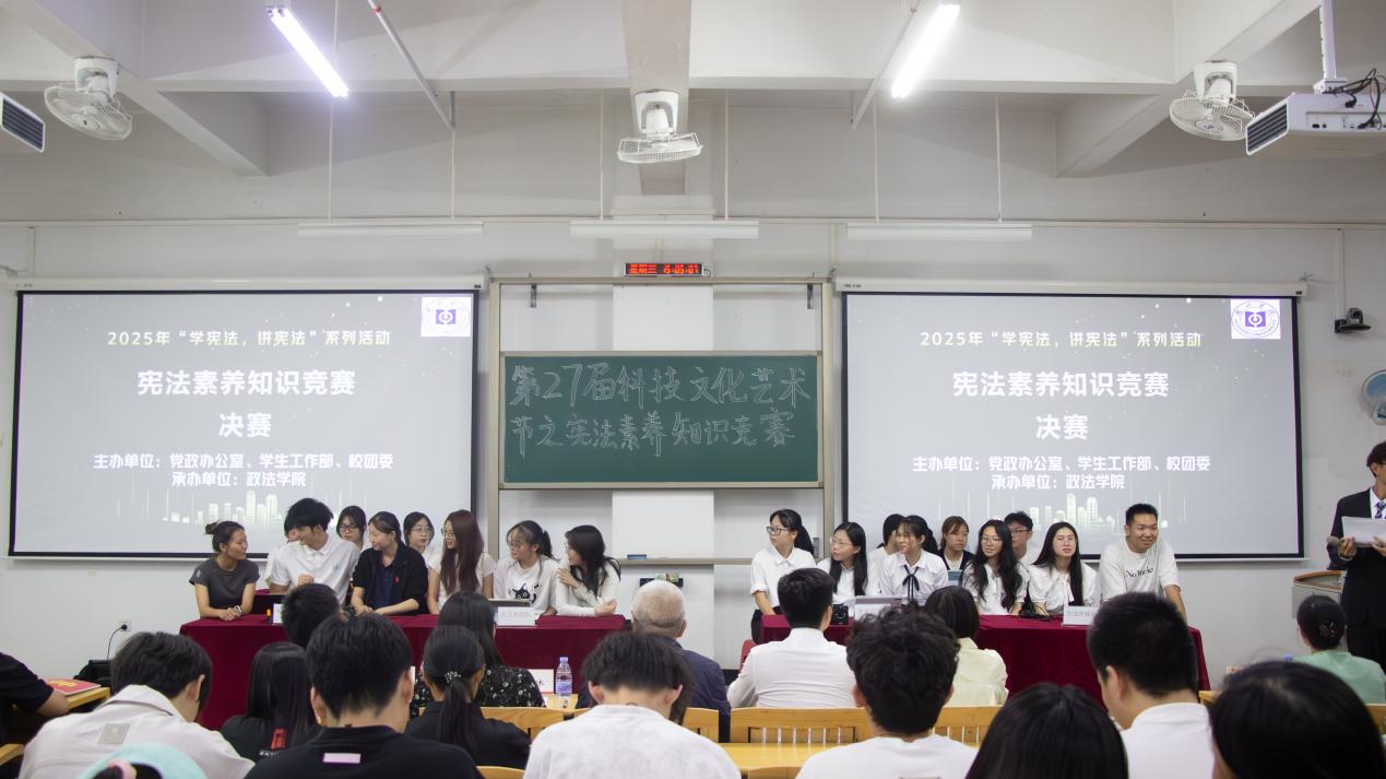 2025年10月29日下午,由党政办公室、学生工作部、校团委联合主办,政法学院承办的惠州学院2025年“学宪法讲宪法”宪法素养知识竞赛决赛在旭日教学大楼118教室举行。北京市盈科(惠州)律师事务所律师杨焜尧、惠州学院学生工作部思想政治教育科科长刘振聪、生命科学学院团委书记唐冰担任评委,政法学院院长蒋炜、法律系主任黄明慧、教工第一党支部书记陈新华、团委书记陈曦以及决赛学院师生代表参加了活动。