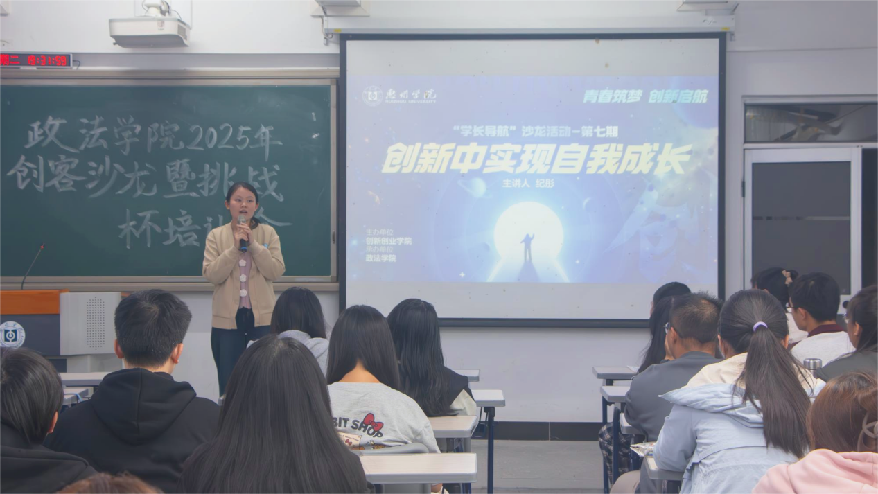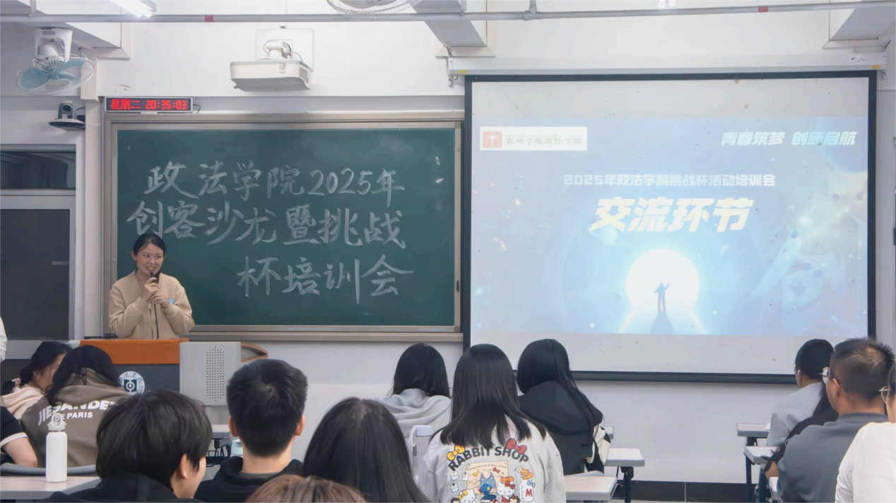 2025年11月4日晚,政法学院在旭日教学大楼210教室,承办开展惠州学院第七期“学长导航”创客沙龙暨“挑战杯”培训活动。活动邀请了政法学院2020届社会工作专业优秀校友、惠州市蓝宝文化有限公司创始人纪彤担任主讲人。政法学院师生代表、其他学院感兴趣学生参与了活动。