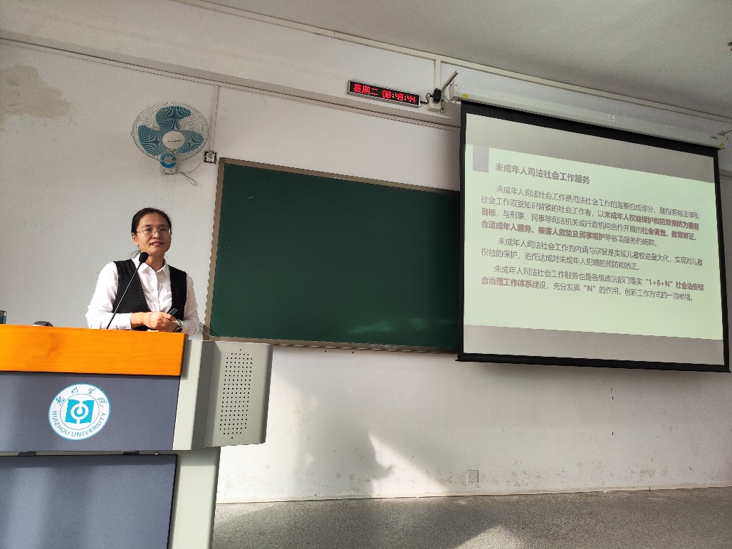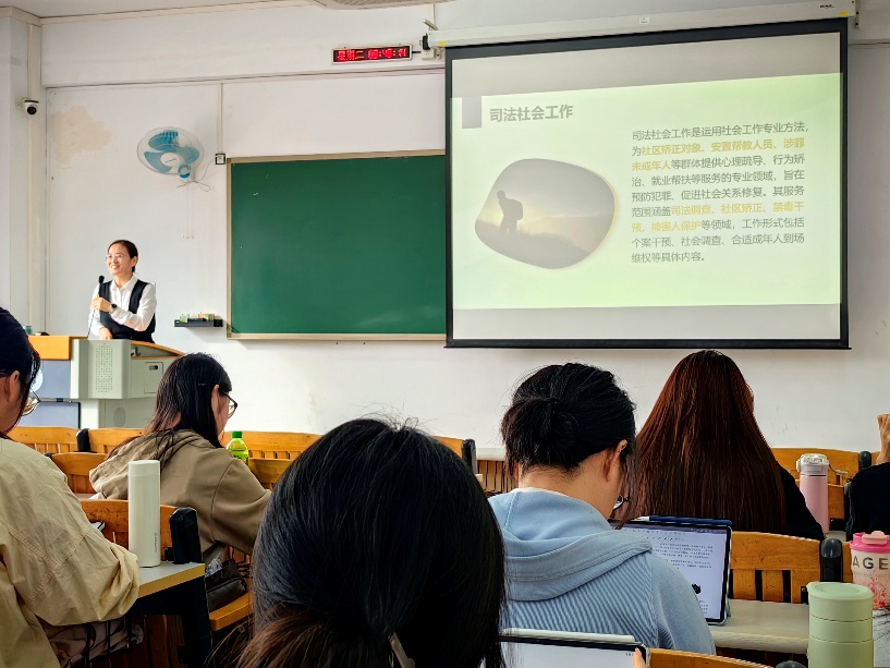 为了推动学生认识惠州市司法社会工作领域的最新进展与实践经验,2025年11月11日上午,社会工作系特邀惠州市惠民社会工作服务中心督导于慧敏在旭日楼204教室面向2023级社会工作1班学生开展了《司法社会工作》嵌入式教学活动。本次活动主题是“未成年人司法社会工作实践分享”,《司法社会工作》课程教师苏志豪担任主持。