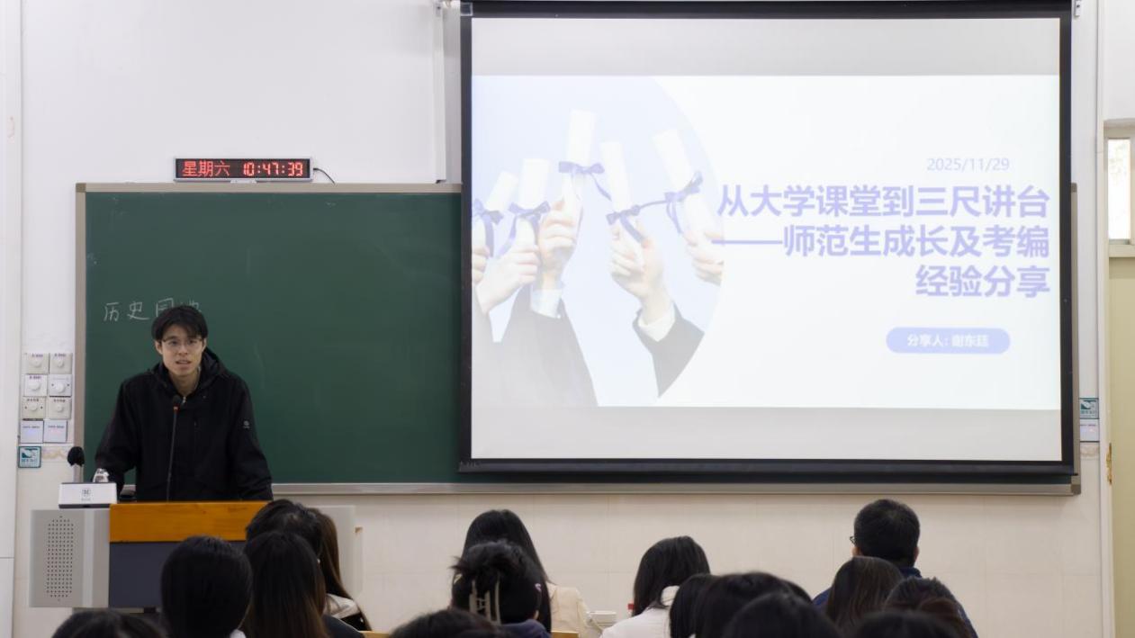 在论坛上,冯紫梦指出历史学科学习的核心在于扎实的知识积淀与持续的能力提升,“经典研读是立身之本,推荐中国知网、国家哲学社会科学文献中心等学术资源,以及‘历史原地’这类优质公众号,平时可以通过摘抄梳理、与同学交流互鉴深化学习成效”。她同时寄语师范生,要深耕教学基本功,“多研读课标教材、借鉴优秀板书案例,既能锤炼工整规范的板书设计,也能打磨清晰的教学逻辑,为未来课堂教学筑牢基础”。