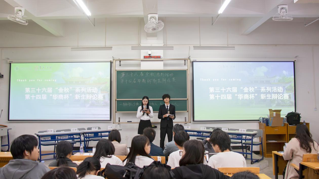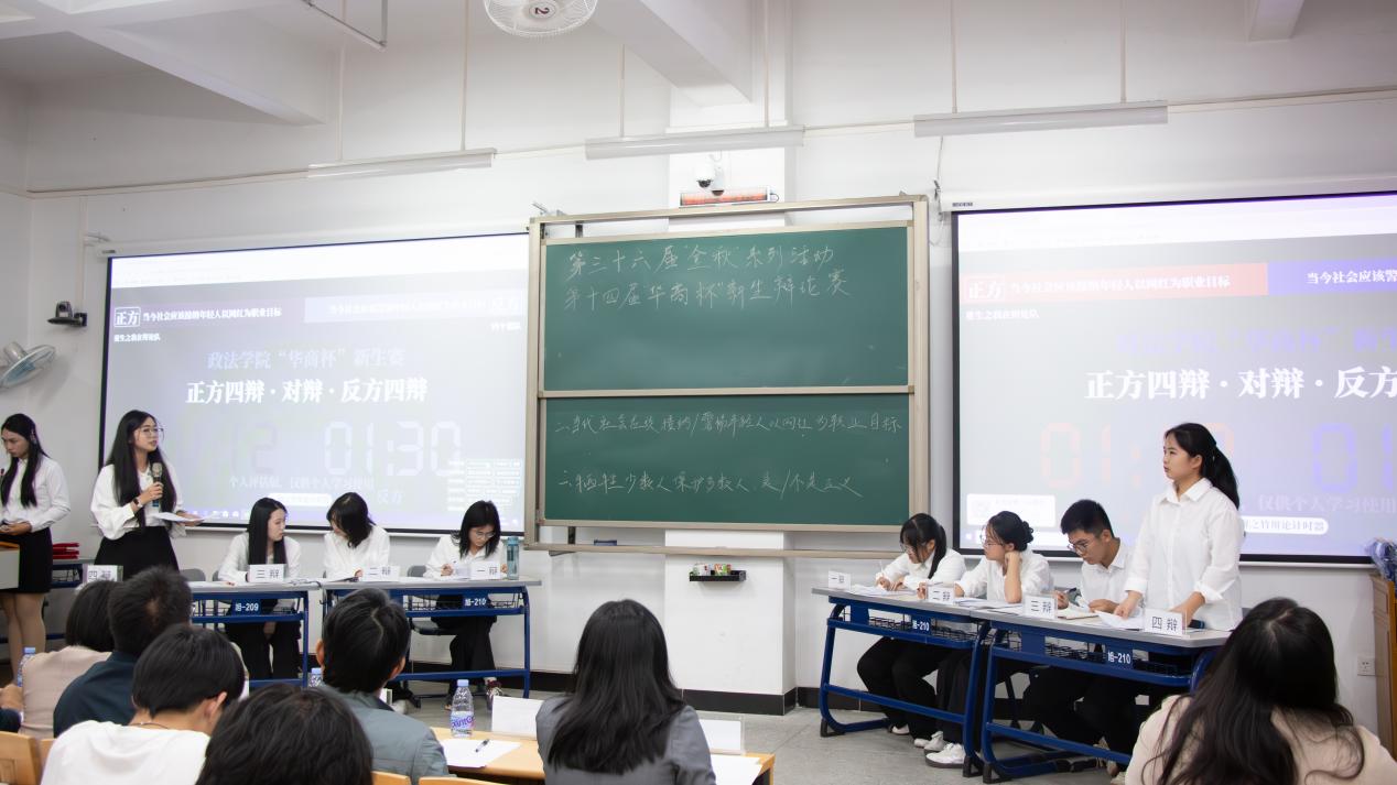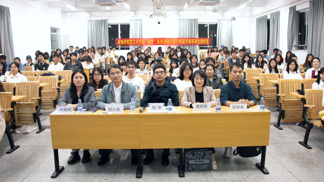 2025年12月3日晚,政法学院第十四届“华商杯”新生辩论赛在旭日教学大楼107教室举行。广东华商(惠州)律师事务所党支部书记郑小龙、律师叶婉琳,政法学院党委副书记刘华、法律系主任黄明慧、团委书记陈曦、专职辅导员许华本,以及2025级学生代表参加本次活动。