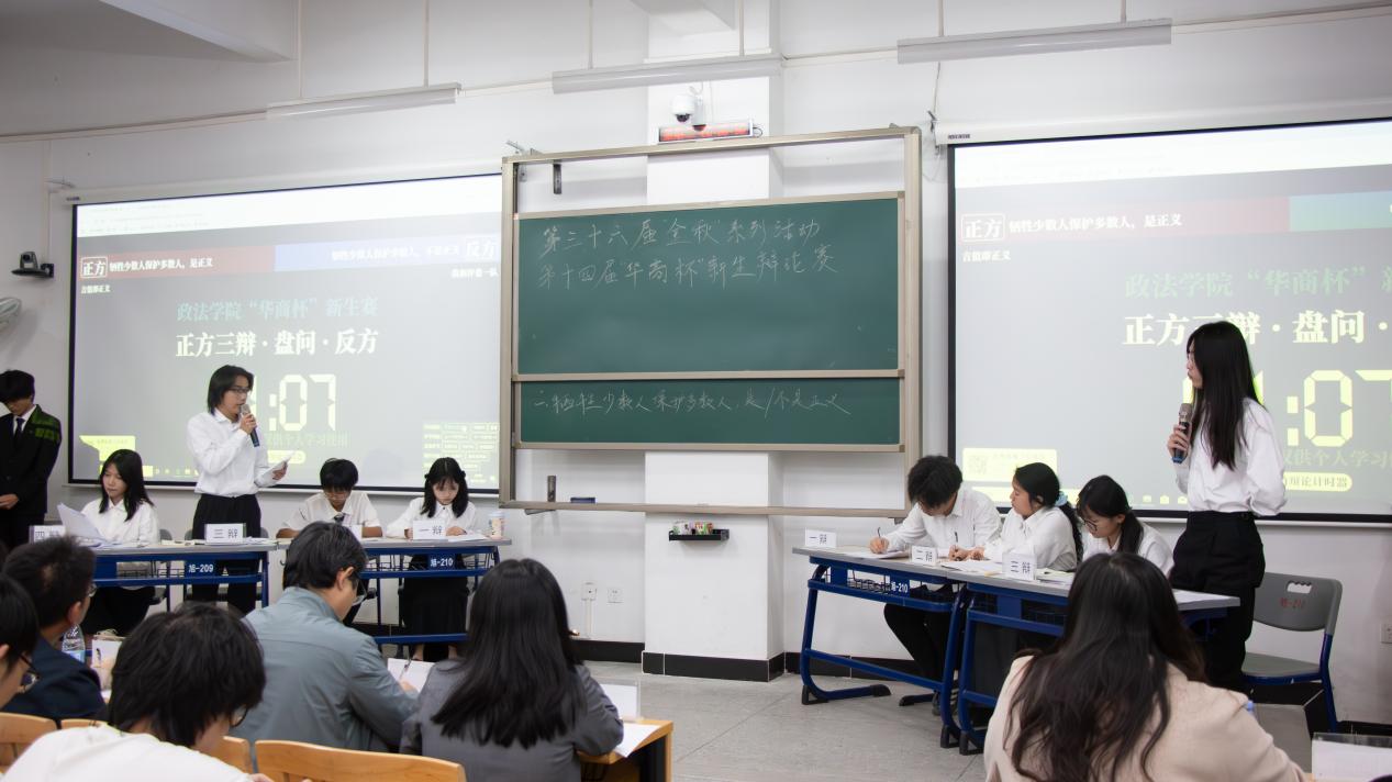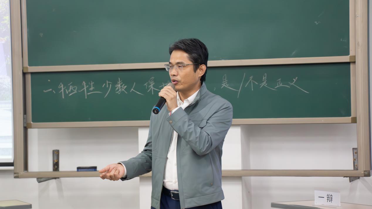 辩论赛共分两场,围绕社会伦理与职业价值等议题展开激烈交锋。第一场以“牺牲少数人保护多数人,是否正义”为辩题,正反双方针对两难情境、生命量化等问题层层剖析,引实例、阐法理,展现出扎实的知识储备与敏捷的思辨能力。第二场聚焦“当今社会应当接纳还是警惕年轻人以网红为职业目标”。正方强调其激发创新、促进社会连接的价值;反方则关注相关职业的潜在风险。双方多角度展开论证,现场气氛热烈,引发观众深入思考。