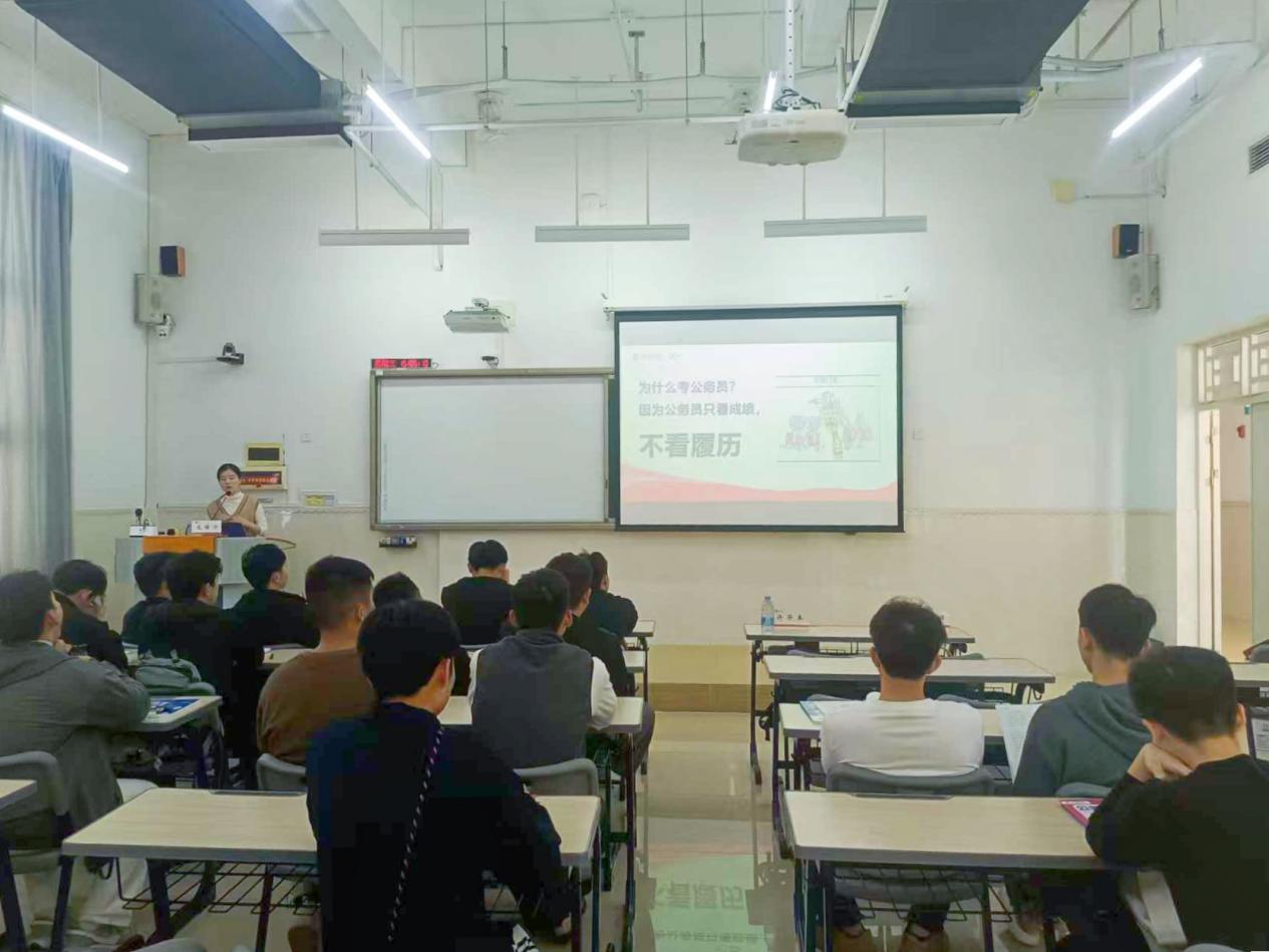为积极落实党中央关于加强军警校衔接的决策部署,进一步促进退伍大学生就业创业,政法学院党委积极响应,于2025年12月17日下午在旭日科技大楼B301开展了“退伍大学生考公专题讲座”活动。本次活动由政法学院学生第一党支部书记、辅导员许华本主持。