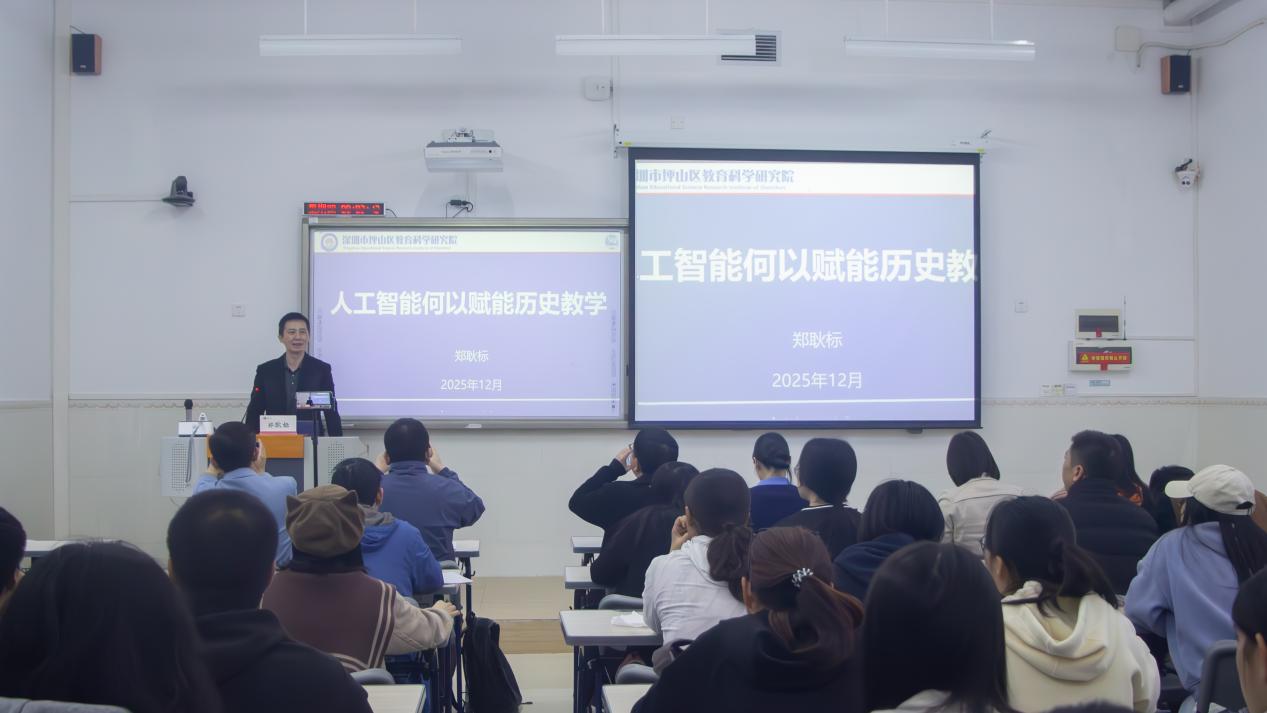 2025年12月18日上午,政法学院在旭日楼科技大楼B座202教室举办学术讲座,特邀深圳市坪山区初中历史教研员郑耿标博士担任主讲嘉宾。讲座以“人工智能何以赋能历史教学”为主题,我院历史学专业师生积极参与,共同探索人工智能与历史教育的融合路径。