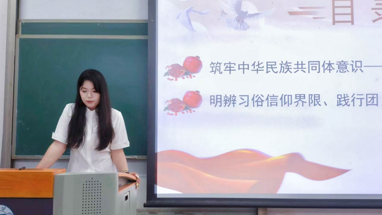 努尔曼古丽·孜克亚分享“五个认同”与“四个自信”的深刻内涵,强调这是铸牢中华民族共同体意识的思想根基,也是激励青年奋勇前行的精神动力。她以自身民族的特色文化活动举例,讲述自己作为团员是怎么严守团员要求以及区分活动参与。她还展示了包括自己民族在内的,部分少数民族优秀传统文化和风俗习惯。如维吾尔族的馕文化、蒙古族那达慕、彝族火把节等等,让入团积极分子和青马班学员在了解和认识中感受少数民族文化的魅力的同时,也能够区分习俗的文化属性与宗教属性,做到“不信宗教、尊重习俗、坚定共产主义信仰”。