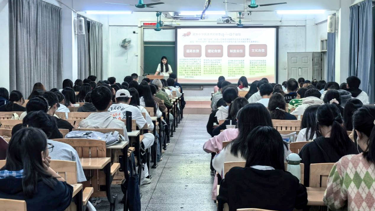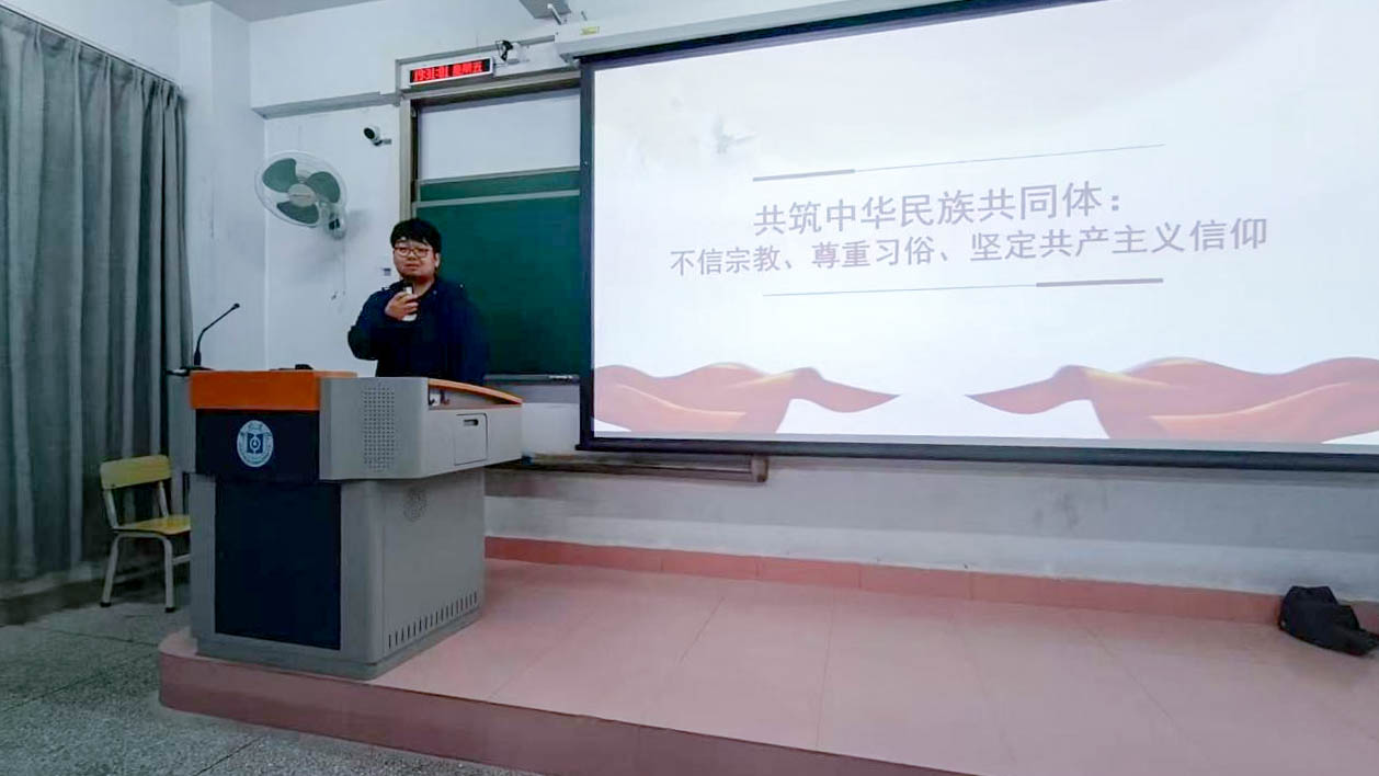 2025年12月19日晚,政法学院在电子楼301教室举办《共筑中华民族共同体:不信宗教、尊重习俗、坚定共产主义信仰》培训讲座。讲座由学院团委书记陈曦主持,努尔曼古丽·孜克亚同学主讲,青马学堂学员、入团积极分子参加。