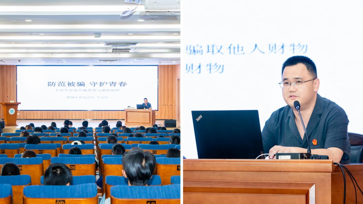 讲堂上,马文星紧扣当代大学生学习生活实际,结合现行法律条文及司法解释,系统讲解诈骗犯罪构成要件,引导青年学子明晰法律底线、敬畏法律权威,树立尊法学法守法用法的法治意识。他结合自身经办的多起真实典型案件,聚焦大学生群体高发的电信网络诈骗、婚恋交友诈骗两大类型,还原案件细节、剖析诈骗分子套路,揭示了虚假刷单、虚假交易、网恋诱导转账等常见诈骗手段,让在场学生深刻认识到诈骗犯罪的隐蔽性与危害性。结合大学生求职就业刚需,马文星有针对性地梳理了求职过程中的各类陷阱,细致讲解因法治意识薄弱遭遇求职诈骗、不慎误入虚假从业圈套沦为违法共犯等典型情形,并深入剖析陷阱的识别要点与规避方法,提醒广大学生保持理性与警惕,切勿因急于求职触碰法律红线,忽视自身权益保护。