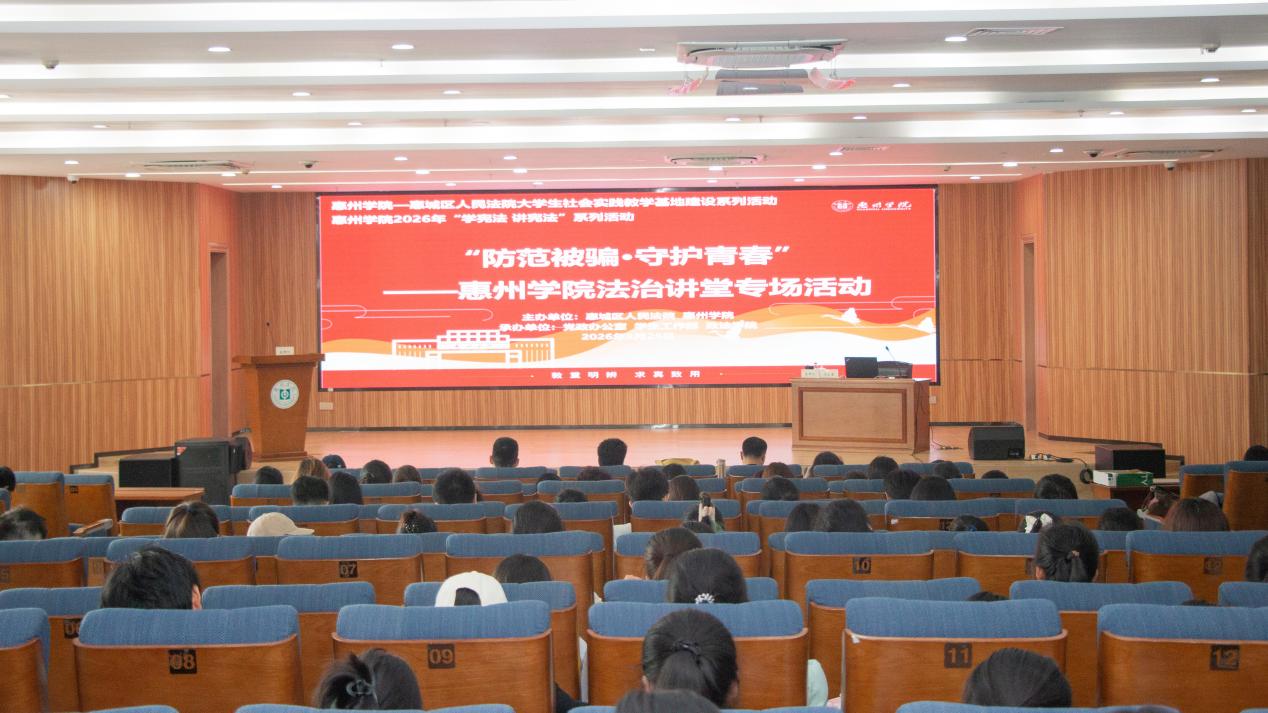 为深入学习贯彻习近平法治思想,全面落实依法治校工作要求,进一步强化青年学生法治观念与反诈防骗意识,筑牢校园安全稳定防线,3月25日下午,由惠州学院党政办公室、学生工作部联合主办,政法学院承办的“防范被骗,守护青春”专题讲座在旭日科技大楼A座201报告厅顺利举行。本次讲座特邀惠州市惠城区人民法院法官马文星担任主讲,300余名师生到场聆听学习。
