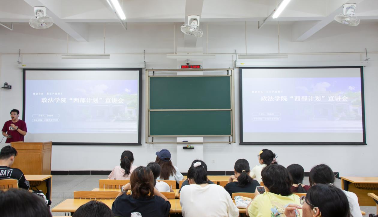 2026年4月10日下午,政法学院在旭日教学大楼106教室举行政法学院2026年“西部计划”志愿者招募宣讲会。会议由学院团委书记陈曦主持,由西部计划全国考评优秀志愿者、2024届校友饶聪辉主讲。毕业班师生代表以及其他年级感兴趣的同学参加。