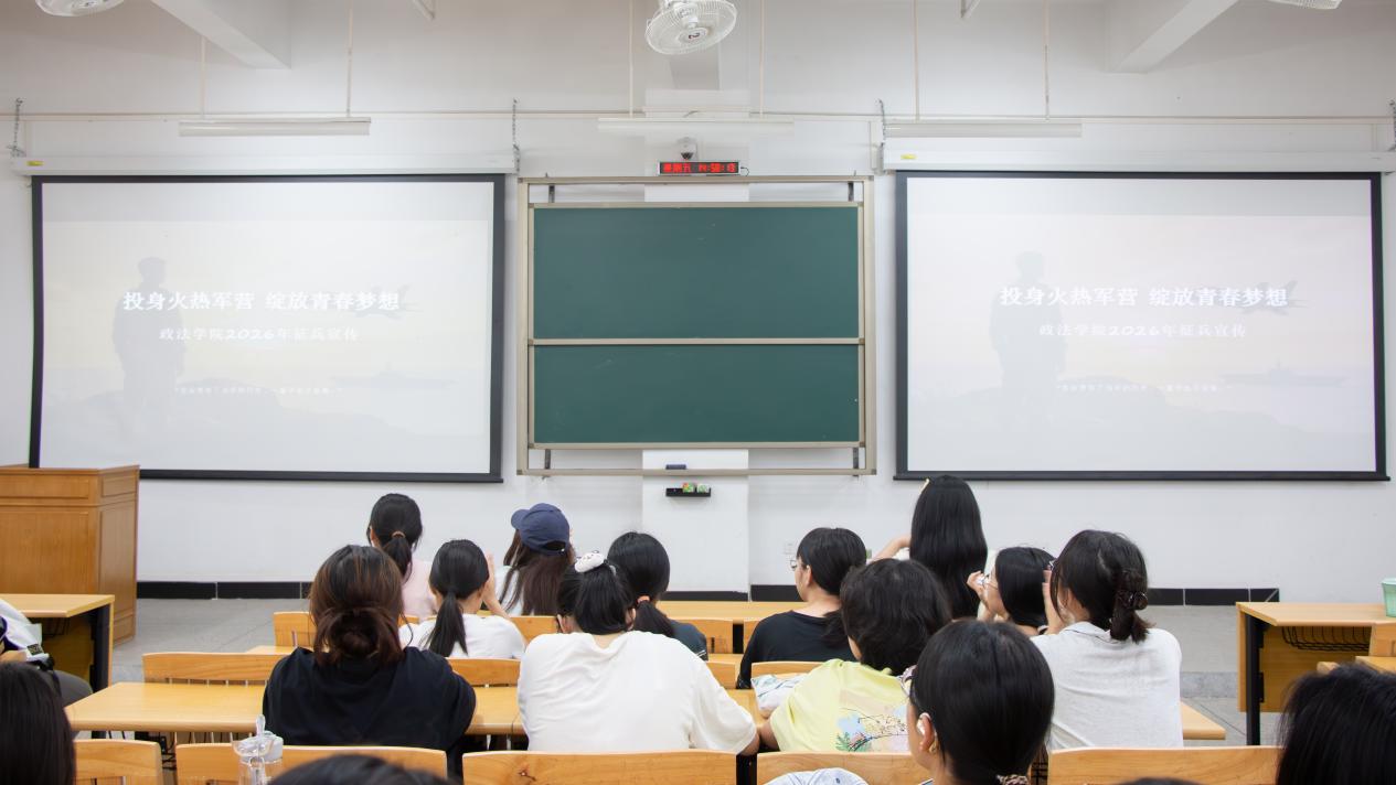 2026年4月10日下午,政法学院在旭日科技大楼B座1608会议室举办2026年征兵宣传动员会。讲座由陈曦主持,许华本主讲,学院学生代表参加。